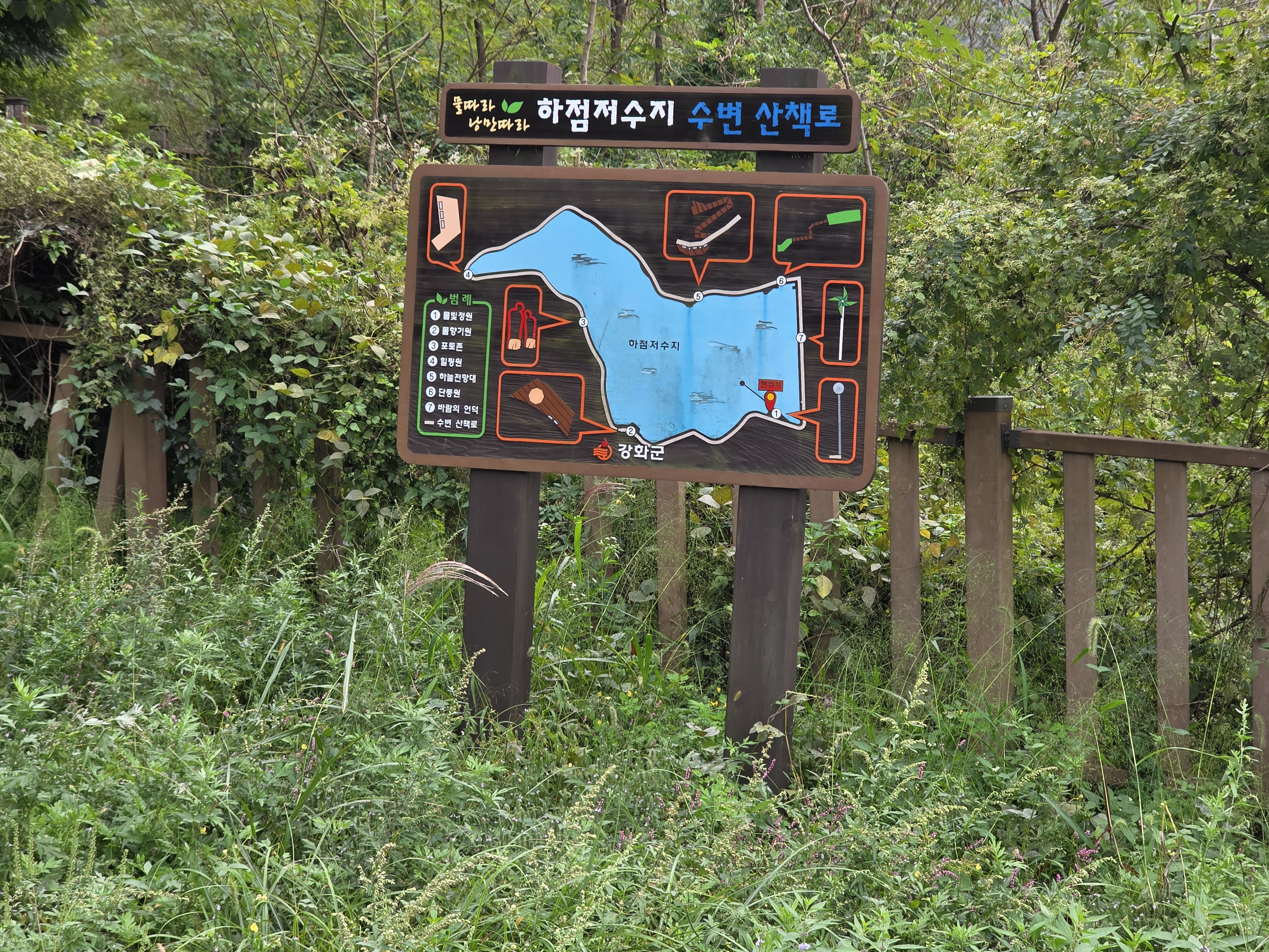 수변산책로가 7개의 테마로 조성되어 있으며 주변에는 야생화가 식재되어 있고
